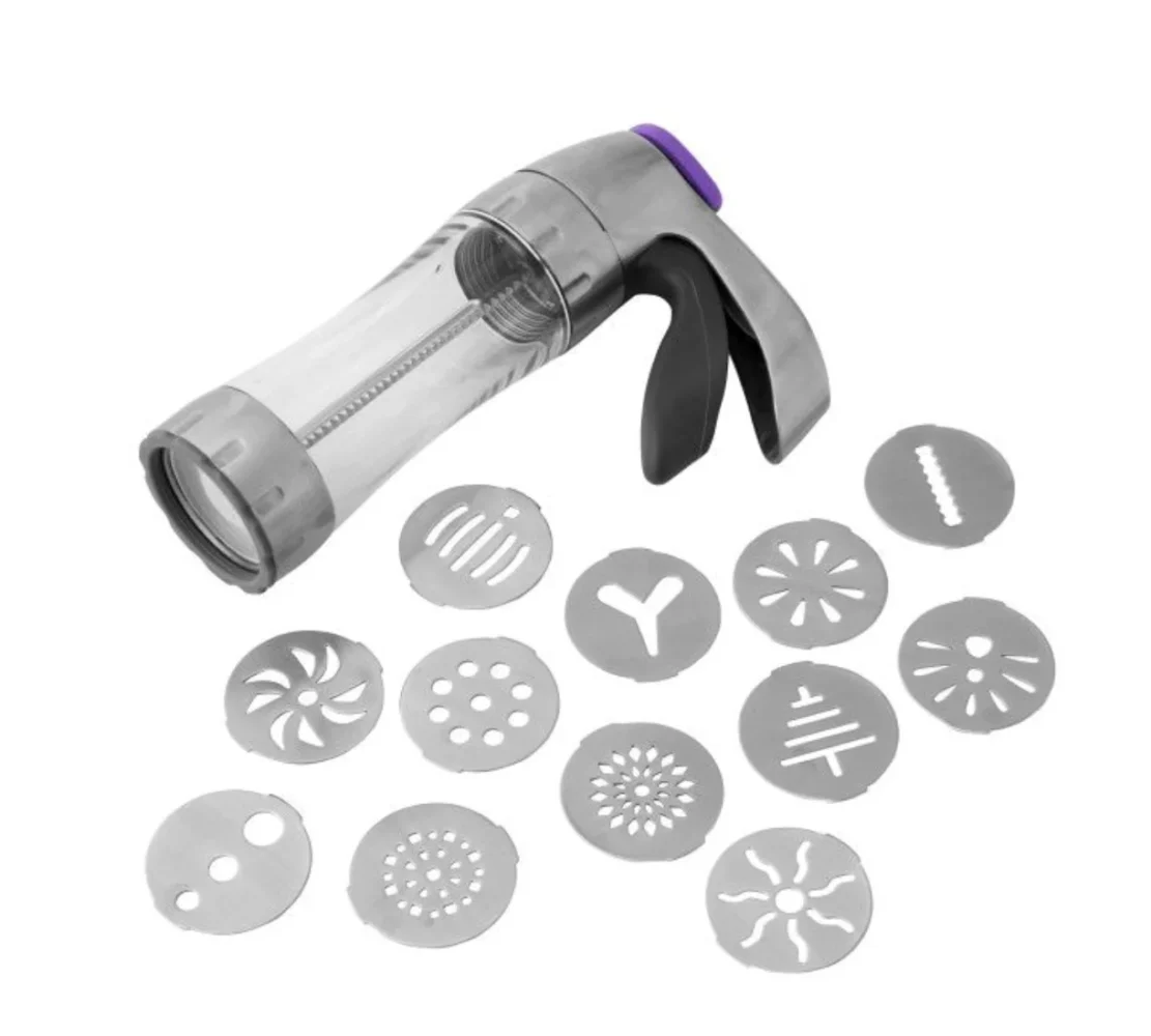Zestaw zawiera 12 wzorów, od klasycznych ikon sezonowych po modne kształty. Zawartość: prasa do ciastek i 12 metalowych krążków.
