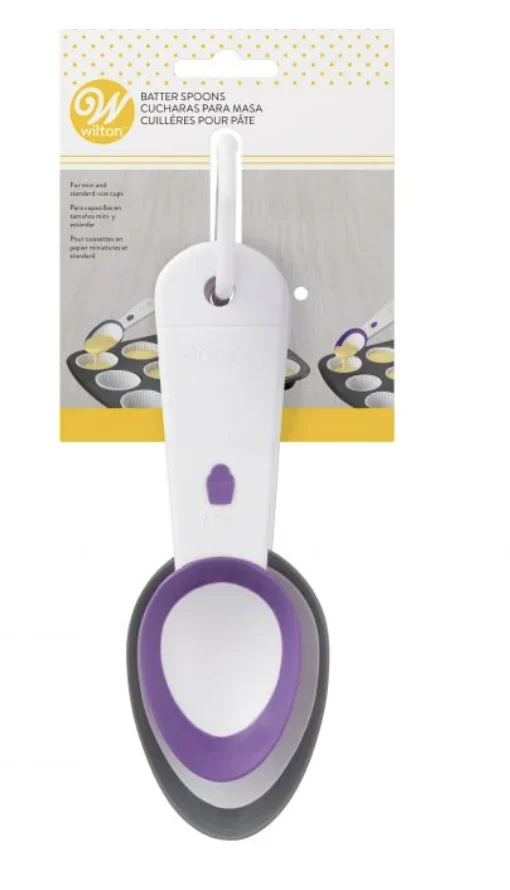 Uzyskaj odpowiednią ilość ciasta za każdym razem dzięki tym łatwym w użyciu łyżkom. Idealne do standardowych i mini babeczek i muffinek, aby za każdym razem wypełnić wgłębienia w 2/3, aby uzyskać równomierne pieczenie i jednolite smakołyki. Silikonowa krawędź jest świetna do zeskrobywania ciasta z misek. Zawiera 2 łyżki. Piecz lepsze babeczki i muffinki dzięki tym łatwym w użyciu łyżkom do ciasta Standardowy i mini rozmiar wypełnia wgłębienia w 2/3, aby uzyskać równomierne pieczenie Materiał: Silikon i plastik Kolor: Biały, szary i fioletowy Można myć w zmywarce na górnym poziomie.