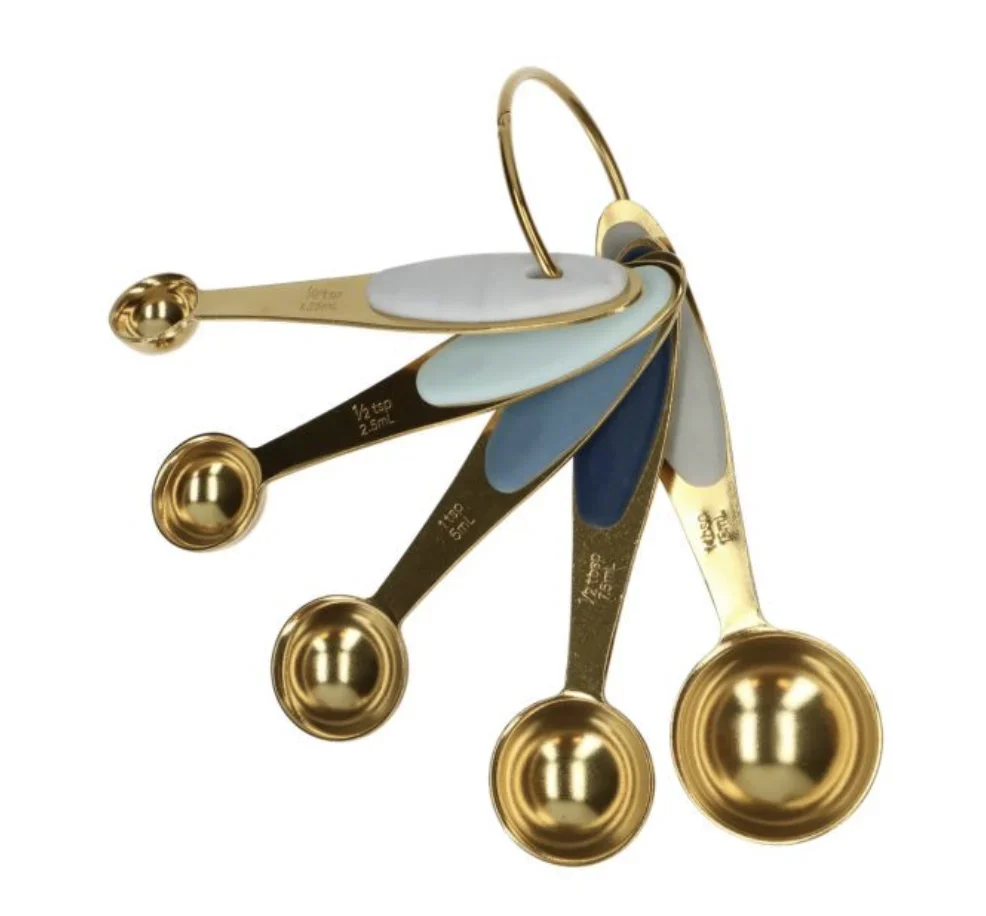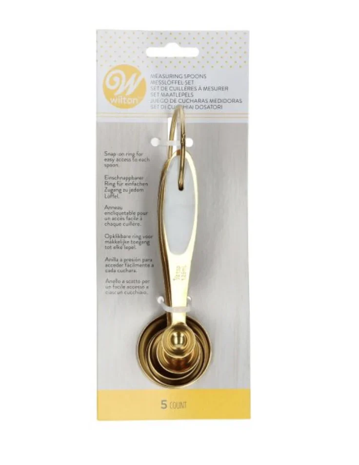 Zestaw 5 miarek, o których zawsze marzyłeś, jest już dostępny dzięki firmie Wilton.Miarki są wygrawerowane na uchwycie każdej miarki, co czyni je bardzo praktycznymi podczas odmierzania.Można je również wkładać jedna w drugą, dzięki czemu zajmują niewiele miejsca. W zestawie łyżka stołowa, 1/2 łyżki stołowej, łyżeczka do herbaty, 1/2 łyżeczki do herbaty i 1/4 łyżeczki do herbaty. Wykonane ze stali nierdzewnej, złote łyżeczki: silikonowe uchwyty