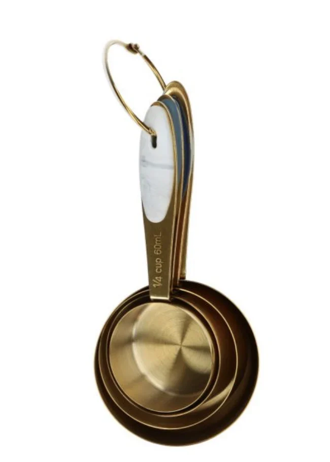Można je również wkładać jedna w drugą, dzięki czemu zajmują niewiele miejsca. W zestawie: 1 miarka, 1/2 miarki, 1/4 miarki i 1/3 miarki. Wykonane ze stali nierdzewnej, złote łyżeczki: silikonowe uchwyty